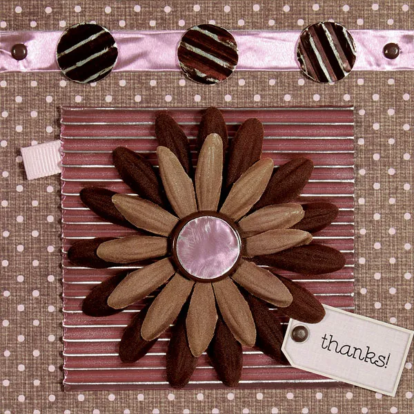 Punch a 3/4" pink circle and sand the edges. Attach centered to a mocha great big brad, then attach to center of two layered flowers. Zot flowers centered over corrugated pink metal square. With the fold at the top, glue dotted paper square even with the card front.