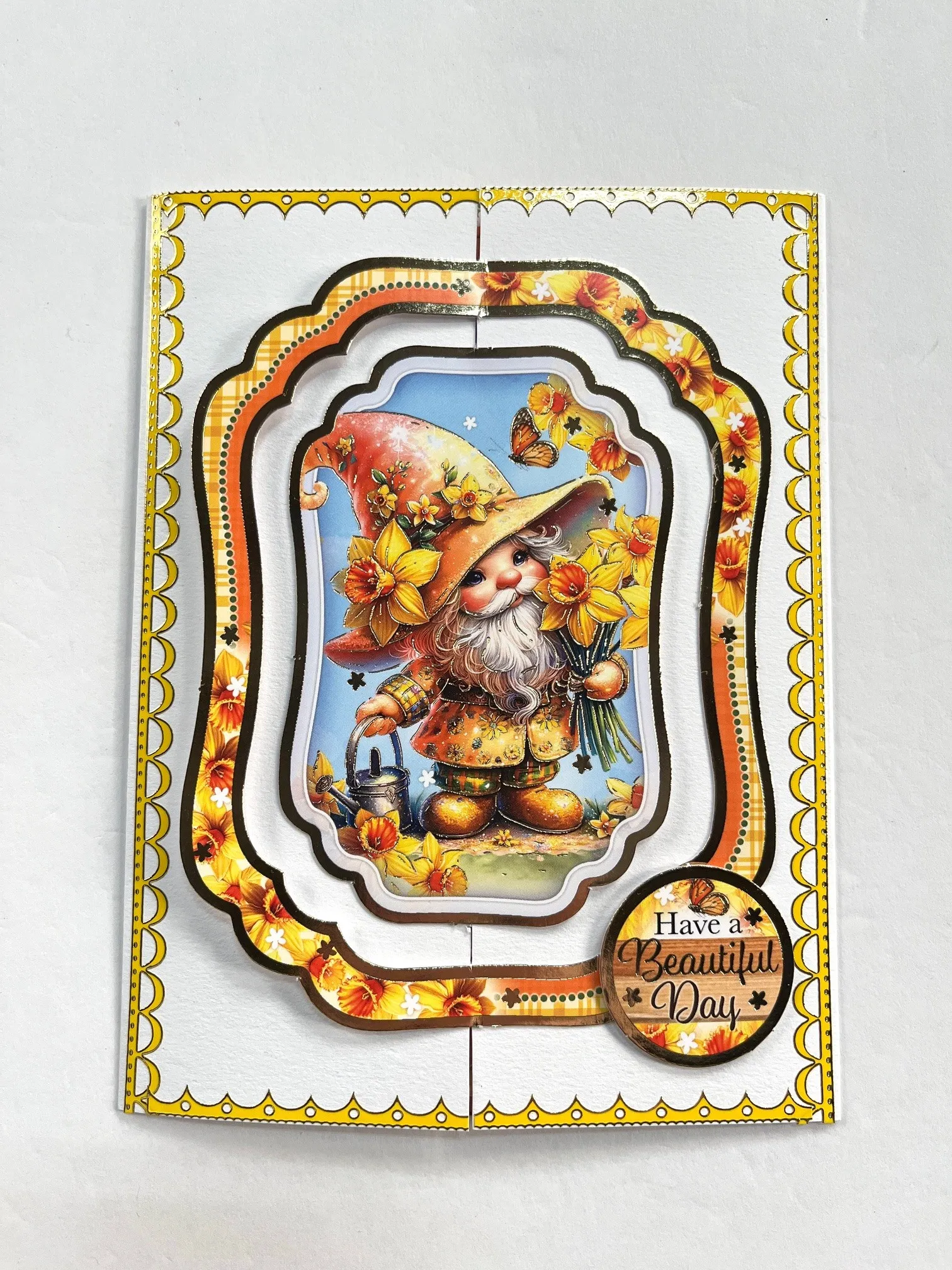 Use the Gnome One Like You foiled sheet and remove the gnome holding flowers and the two frames around him. Glue the outside printed frame to the right “gate” but ONLY gluing the right side of the frame to the right gate. Glue the gnome holding flowers to the center of the frame but attaching ONLY the left side to the left gate. Foam tape “Have a Beautiful Day” on the lower right. Place yellow fancy border Dazzles™ around the edges of the card.