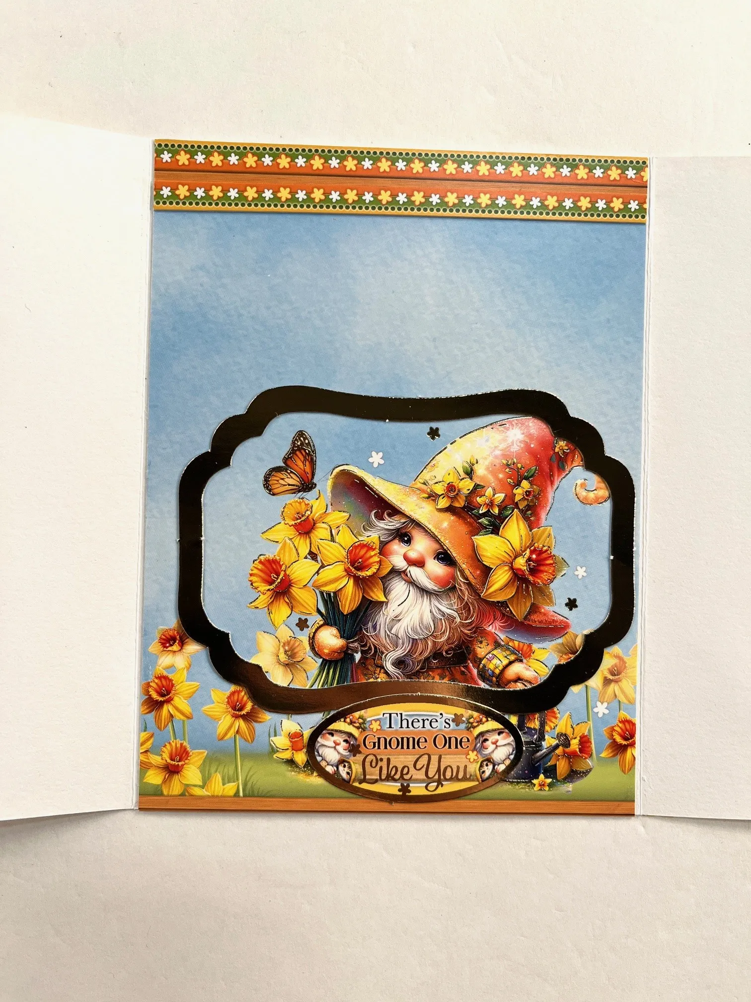 Inside: Cut 4 7/8”x6 ½” area of the foiled gnome with flowers. Glue to the card inside. Notice how the cardstock was cut. Use 1/8” extra sticky tape to attach the gold frame horizontally around the gnome. Attach “There’s Gnome One Like You” at the bottom.