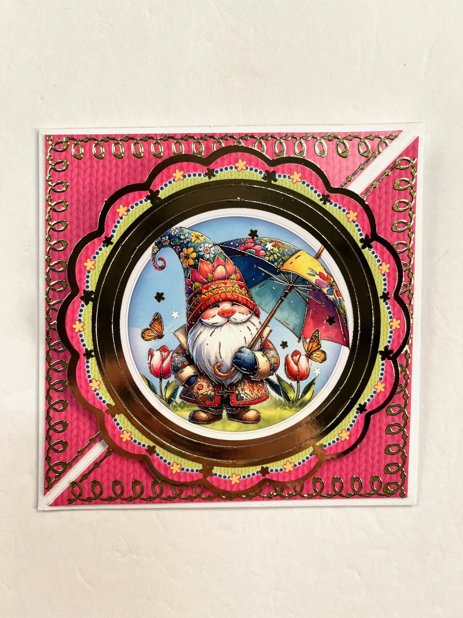 From the Blooming Lovely Day sheet, remove the frames and gnome holding an umbrella. Cut 4” square of white cardstock or use one of the cards. Place, don’t glue, behind the gnome and frames. Cut off any excess white and glue to hold the three pieces together. Foam tape the bottom part of the gnome and frames to the bottom part of the card.