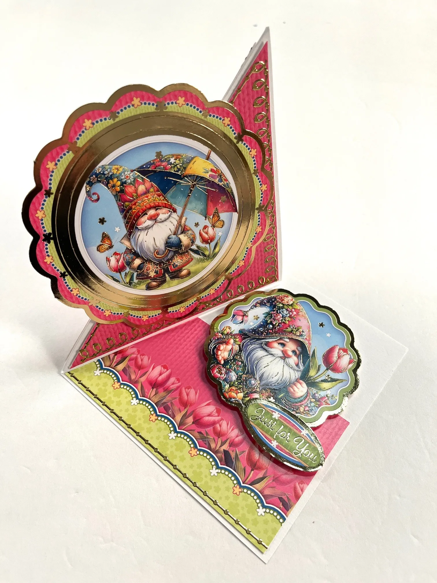 Inside: Cut 4 ¾”x2 5/8” pink border Adorable Scorable and glue to the bottom of the card. Use a double layer of foam tape to attach the gnome holding a tulip at the upper right. This will hold the card front when the card is open. Foam tape “Just for You” at the lower right.
