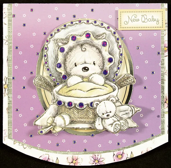 Assemble the baby in a basket paper tole design with foam tape. Glue to the card front. Foam tape the “New Baby” sign to the top right corner.