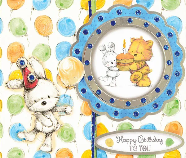 Color the scalloped circle from the “Let’s Party” page with TB4. Color the cat with TN3 & CR1. Color the rabbit with GG1, and the cake with TN3 & GB4. Glue the right side of the scalloped circle to the right gatefold panel so it is just overlapping the left panel. Foam tape the inner silver circle in place, then glue the cat and rabbit circle as shown. Foam tape the “Happy Birthday” oval on the bottom right. To close, tuck the scallop circle under the balloon on the left side. Place Jewel & Border Dazzles™ as shown.