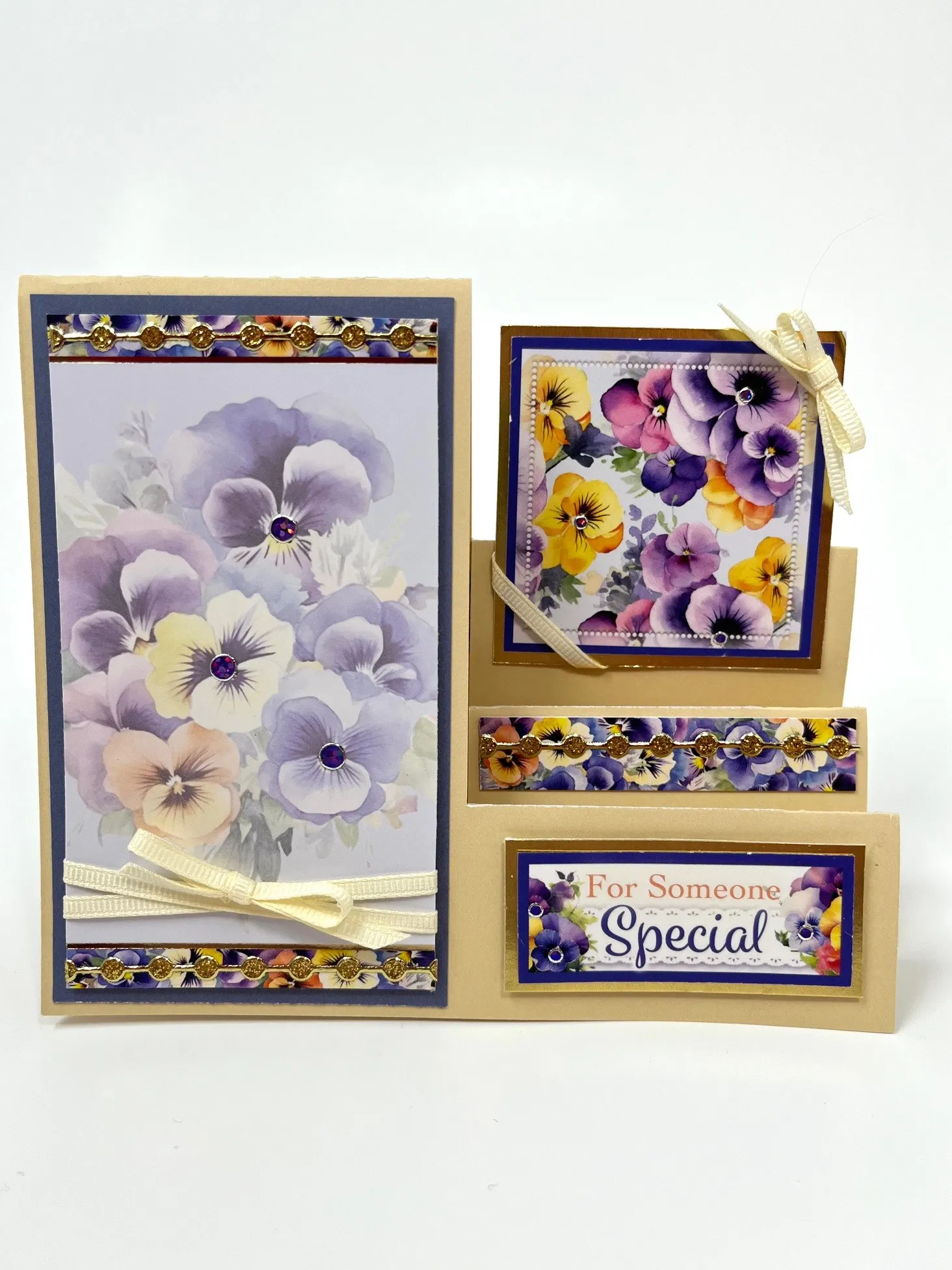 Die-cut and fold the Side-Step Card die out of the light yellow cardstock following the instructions on the package. For the main area using the "Perfect Pansies" sheet, trim off 1" from both left and right sides of the lighter square on the reverse side of the main area. Place gold Jewel Border Dazzles™️ at the top and bottom along the pansy borders. Wrap 5 1/2" ivory length around the bottom crisscrossing at the center securing to the back with extra sticky tape. Make and Zot™️ a 1 1/2" bow at the center. Mat on light blue Solid cardstock with 1/8” borders. Tape to the card.