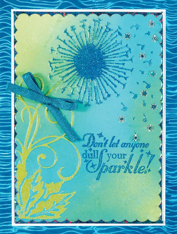 Inside: Lightly mist the inside of the card with Key Lime and True Turquoise Glimmer Mist and let dry. Mist 3 1/4”x1” white cardstock with both colors of Glimmer Mist and let dry. Place the cardstock on a portion of the swirls on the Dandelion Embossing Folder and emboss just one end of the rectangle with swirls as shown. Use the brayer and VersaMark™ stamp pad over the swirls and sprinkle with Zing! Leaf embossing powder. Mask off the Smart & Sassy Sayings “Don’t let anyone…” and only use the word “Sparkle!” on the embossed rectangle. Heat emboss with Zing! Blue Glitter and embellish swirls with Teal Jewel Flower Dazzles™. Mat rectangle with white cardstock, leaving 1/16” border and mat again with 1/4” border of Cobalt Holographic Ripple Paper. Glue to the card center.