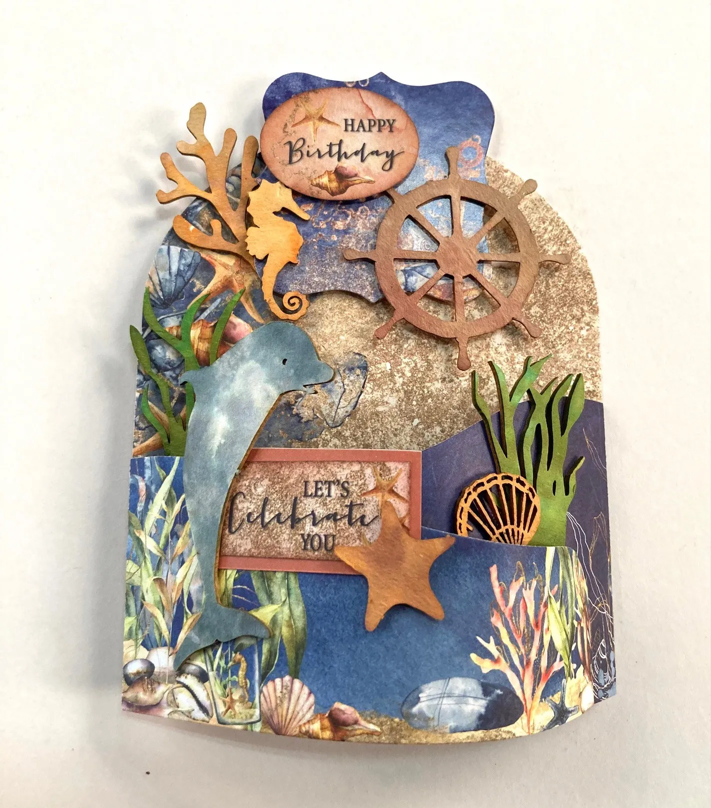 5. For the center & front layers: Glue the seaweed and clamshell to the center layer near the right edge as shown. For the front layer, cut out the “let’s celebrate you” cutout and ink the edges with Cocoa Bean. Mat it on caramel solid cardstock, then use the bone folder to gently curve it to fit the curve of the bendi card. Glue it to the front cardstock extending above the upper edge, then glue the dolphin and starfish as shown.