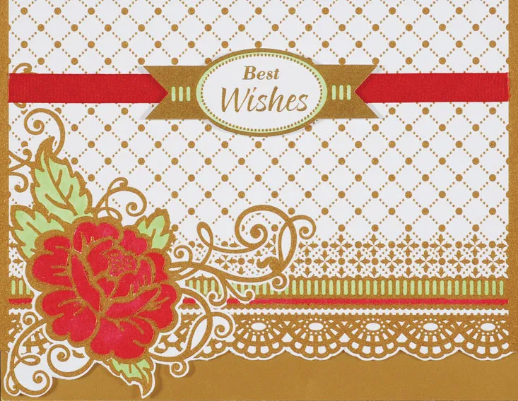 Glue the card topper even with the card front. Trim along the bottom edge of the swirls, leaf, and lace design leaving a thin white border. Cut a 6 1/4" length of red ribbon and glue centered across the card front, 1” from the top. Cut out the “Best Wishes” label. Use the green pen to color in the edge of the oval and the lines at each side of the oval. Foam tape centered on the ribbon.
