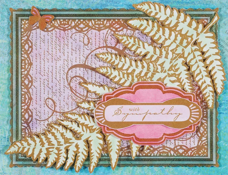 On one Fern Card Topper, cut around the frame. Then, chalk the frame in turquoise and the background in purples.