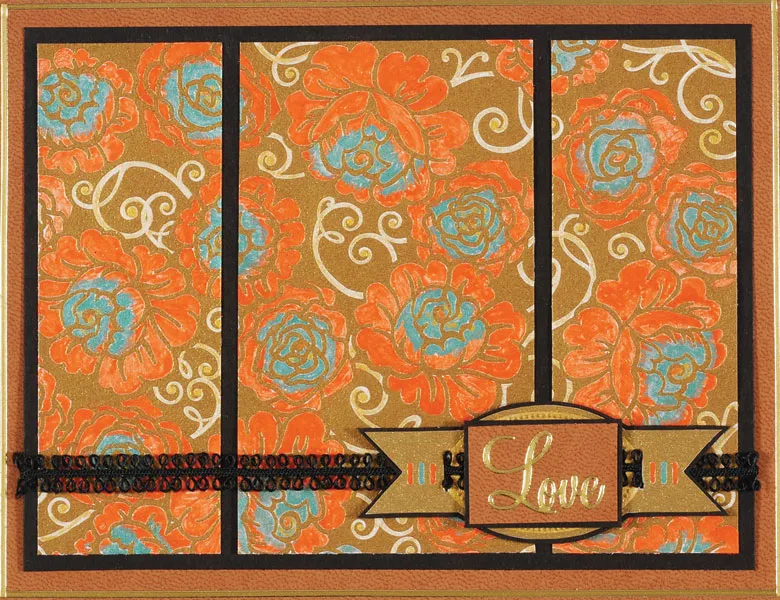 Cut out the all over roses Color Me™ Card Topper and cut to 5 1/2”x4 1/4”. Use a wet brush to paint the outer petals of all the roses with Mandarin Perfect Pearls™. Paint the inside of each rose with Mint, and use the Smooch® ink to paint the vines. Let dry. Cut the Card Topper into three pieces: two at 1 1/2”x4 1/4” and one at 2 1/2”x4 1/4”. Glue to the black cardstock leaving 1/8” between each piece, as shown.