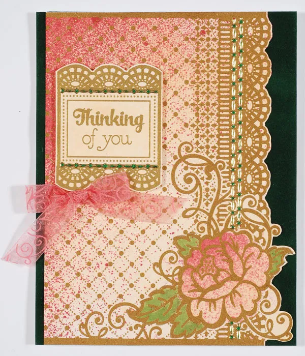 Trim the edge of the card topper along the lace border, rose, and swirls leaving a 1/16” border. Place the topper so the rose is at the lower right corner. Trim 1/8” from the left side of the card topper. Use the small paint brush to paint in the leaves with English Ivy ink. Let dry. Glue the card topper to the suede covered card front, 1/8” from the left edge. Foam tape “Thinking of you” to the left side of the card topper 1” from the top and 3/8” from the left edge.