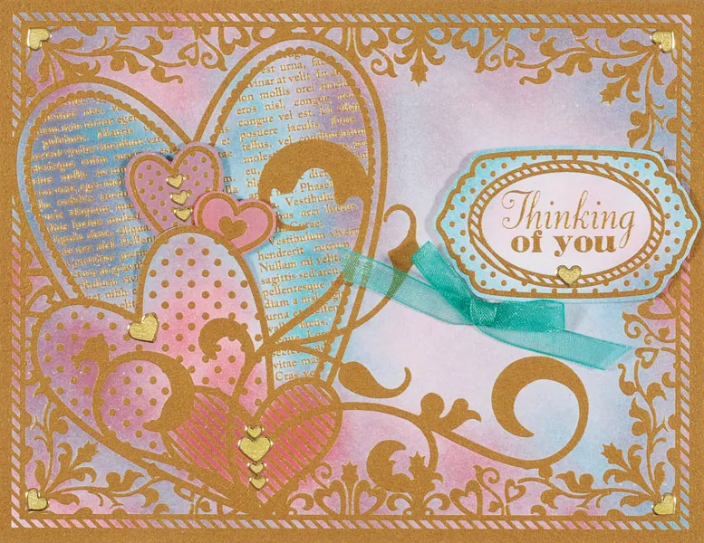 Color the edges of the “Thinking of you” label with Broken China ink. Very lightly add Worn Lipstick ink over the center oval. Wipe off the excess ink. foam tape the label to the right side of the card as shown. Embellish with Gold Heart Pearl Jewel Dazzles™ as shown. Use a 10” length of 1/4" wide teal sheer ribbon to tie a bow. Zot the bow near the label.