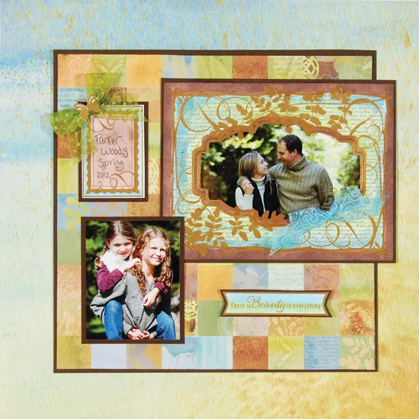 Place a photo behind the Card Topper opening and mat with brown cardstock, leaving a 1/8” border. Glue 2 1/4” from the top and 3/4” from the right. Use 9” of 1/2” wide blue organdy ribbon to make a bow and glue to the bottom right edge of the frame. Mat a 2 3/4”x3 1/2” photo with brown cardstock, leaving 1/8” border and glue the bottom left page corner, overlapping Card Topper.