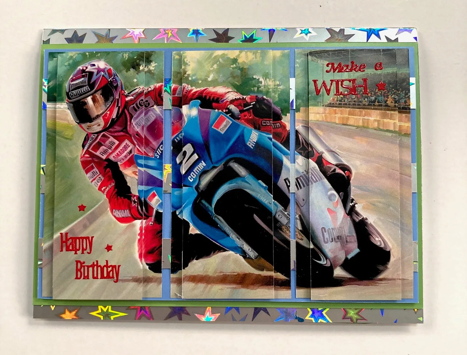 Card inside: Cover with blue Adorable Scorable. Cut a 6"x5" of silver stars holographic and green Adorable Scorable. Position the silver stars holographic at an angle with the top left corner 1" from left and 1/4" from top and secure with extra sticky tape. Trim off the excess. Mat the race car image on green Adorable Scorable leaving a 1/16" green border. With extra sticky tape place piece at an angle 1 1/4" from the top left as shown. Trim off the excess. Place the Tiny Words and Phrases Dazzles™️ around the card as shown.