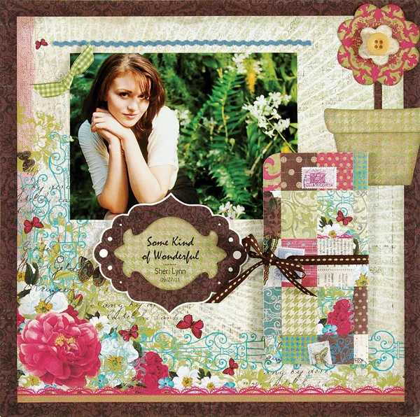 Glue a 5”x7” photo 2” from the left edge and 1 1/2” from the top. Using the Playful Pockets template cut a flower from Boutique pink/green paper, a flower center from light paper, and a flowerpot from the green houndstooth. Cut a 1/4” strip of brown for the stem. Ink the edges and glue the flower to the upper right corner of the page as shown with the stem glued underneath. Foam tape the flower center and Zot™ the button on the flower. Fold the top “rim” of the flowerpot back and ink along the fold to define the rim. Glue to the page and trim the excess.