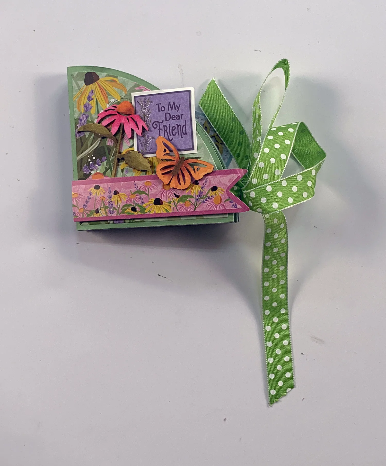 Cut two 10" lengths of lime ribbon and use tape to secure one end of one to the front and one to the back, both extending from the curved edges and ¼" from the bottom. Punch out the Secret Garden pink banner die-cut and cut to 3½" long. Foam tape it to the lower front, extending from the left edge and covering the ribbon end. Die cut a quarter-circle from Secret Garden blue corner paper and glue it centered on the back.
