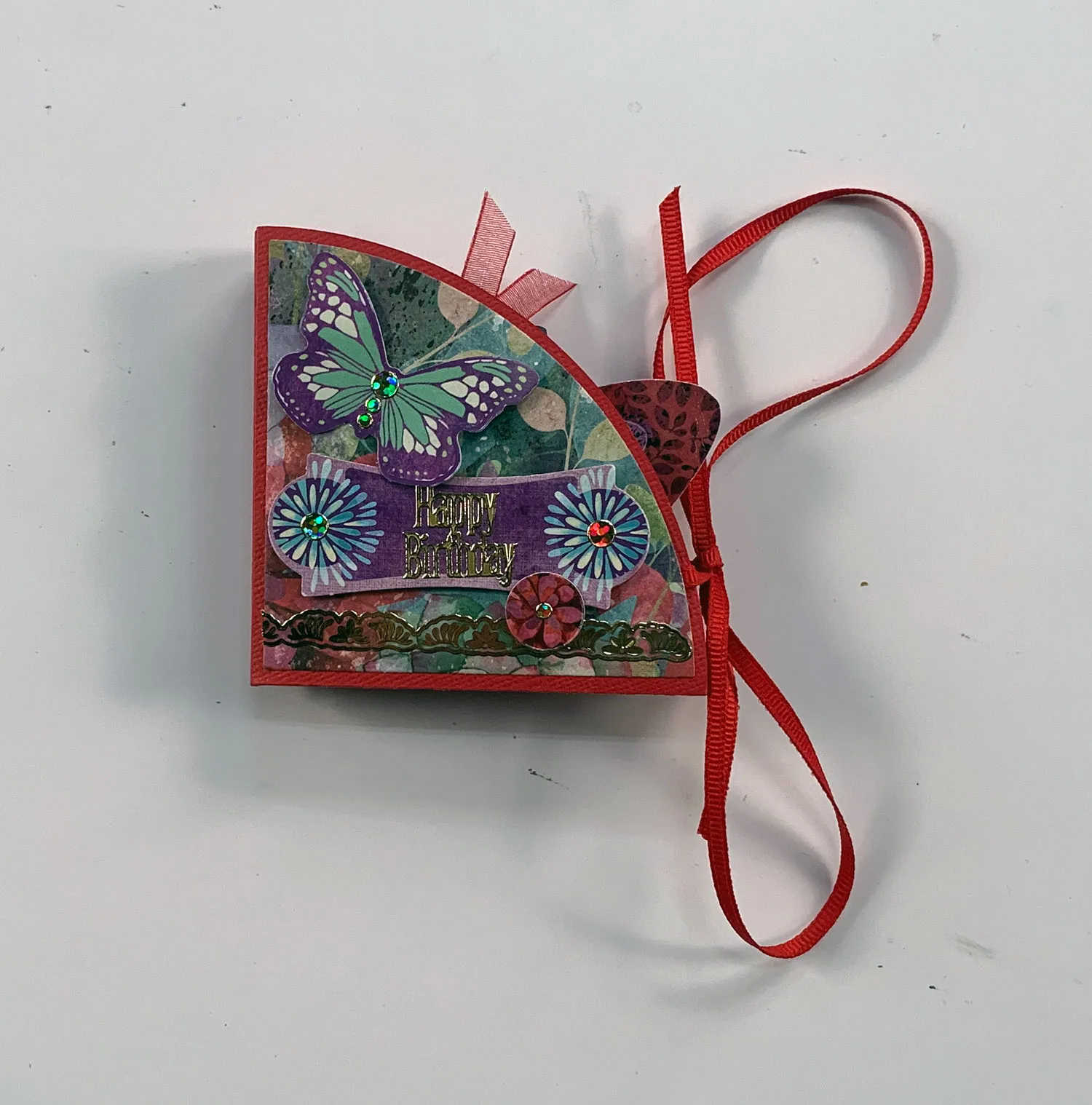 For the front & back: Cut two 10" lengths of 1/8" red grosgrain ribbon. Use tape to secure one end of one to the front and one to the back, both near the curved edges and ¾" from the card bottom.