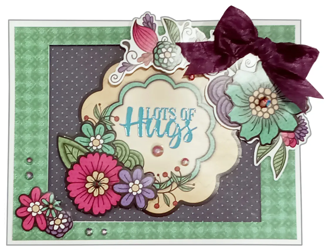 Glue the green #1 image inside the card so it shows through the rectangle. Use foam tape to attach green #2 to #4 over the matching art. Place “Lot of hugs” Dazzles™ stickers in the center. Glue Crystalz as shown.