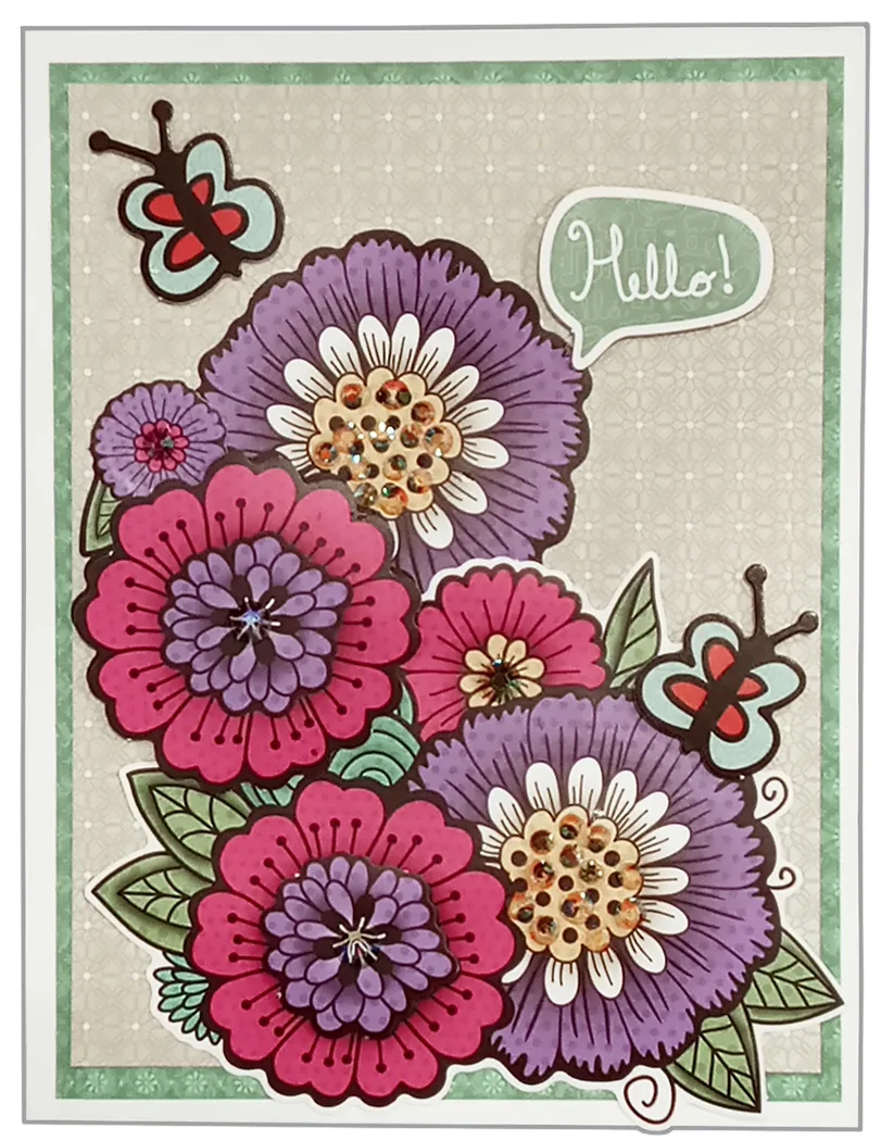 Split up the paper tole into two sections and build up with foam squares. From the Die Cut sheet foam tape the balloon, butterflies, and "Hello" as shown. Glue the Crystalz to flower centers as shown.