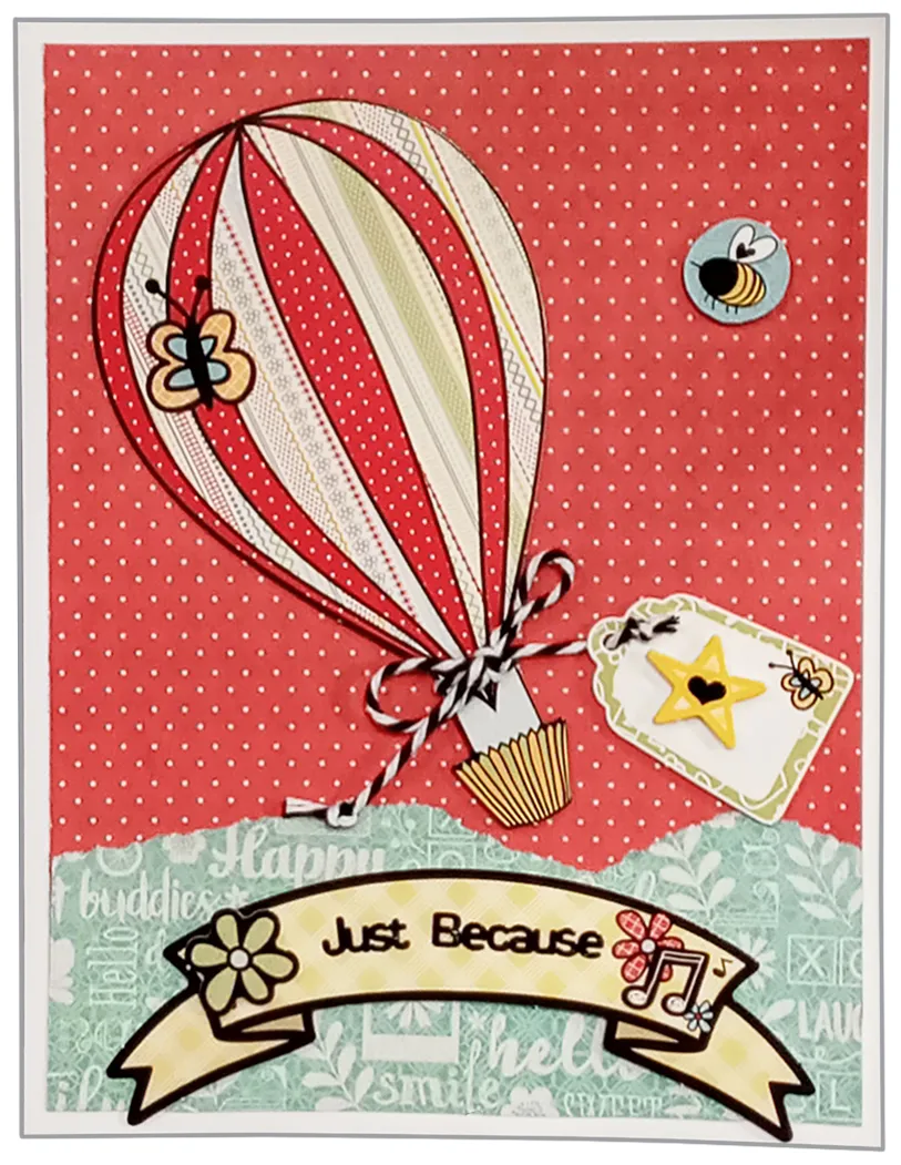 Cut 4 ¾”x6 ¼” dot Little Things paper. Cut 4 ¾”x3” teal Little Things and tear along the top edge. Glue to the bottom of the dot paper. Glue to the card front. Foam tape the hot air balloon, banner, tag and bee as shown then foam tape the star and flower on top. Zot a black baker’s twine bow on the balloon. Place “Just Because” Dazzles™ stickers on the banner.