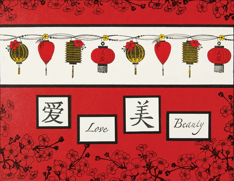 Stamp the words “love” and “beauty” and the Chinese symbols for love and beauty onto white cardstock and cut out each image. Mat each onto black, leaving a 1/16” border. Glue the pieces to the card staggered below the lantern border as shown. Ink the edges of the card black.