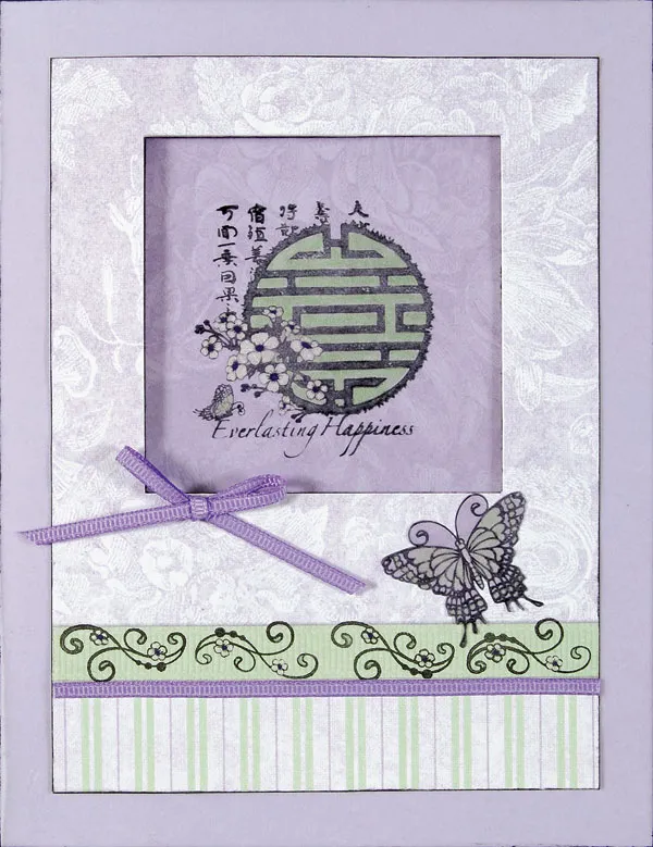 Open the card out flat, facing up on your cutting mat. Use your knife and ruler to cut a 2 ¾” square window from the card front, centered on the lavender floral paper 1” from the top of the card. Remove the lavender floral square that you cut from the card front and glue lavender vellum over it, trimming edges evenly. Ink the edges black. Stamp the round “Everlasting Happiness” image centered on the vellum-covered square with black ink and let dry. Stamp two large butterflies on remaining lavender vellum, let dry, then cut them out.