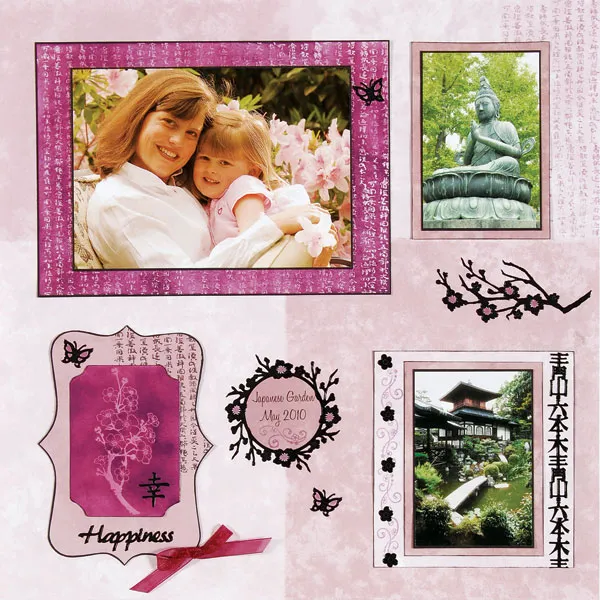 Use sweet plum ink to stamp the Asian writing image over a 2” x 5” section of the background paper at the upper right edge and let dry. Mat remaining photos on black, leaving a thin border. Mat again on dark pink paper, leaving a ¼” border. Ink the edges black. Glue one matted photo overlapping the stamped background as shown, 1” from the right side and 7/8” from the top.