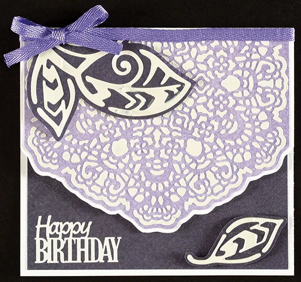Place the Zen Leaves stencil on dark purple paper and apply embossing paste on the two leaves at the end of the large leaf cluster. Move the stencil and apply paste on the small leaf. Let dry and cut 1/16” from the leaves. Glue the leaf cluster at the upper left, as shown, and tie lilac glimmer ribbon around the fold, with a bow on the left.