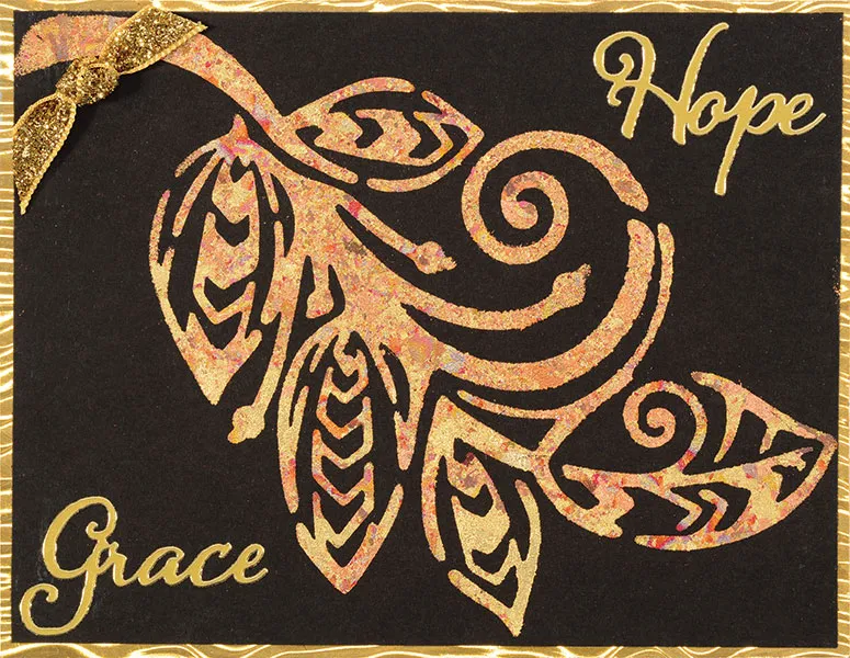 Tape off the two small leaves on the stencil. Tape the stencil to a 6 ¼”x4 ¾” brown cardstock. Use the cosmetic sponge to apply Flitterglu to the stencil. Make sure it is evenly covered. Remove the stencil and pour Megaflakes over the glue. Push the flakes in to the glue. Remove the excess, and put back into the jar. Use the Scoochy Foam to remove the rest of the excess, and burnish the flakes.