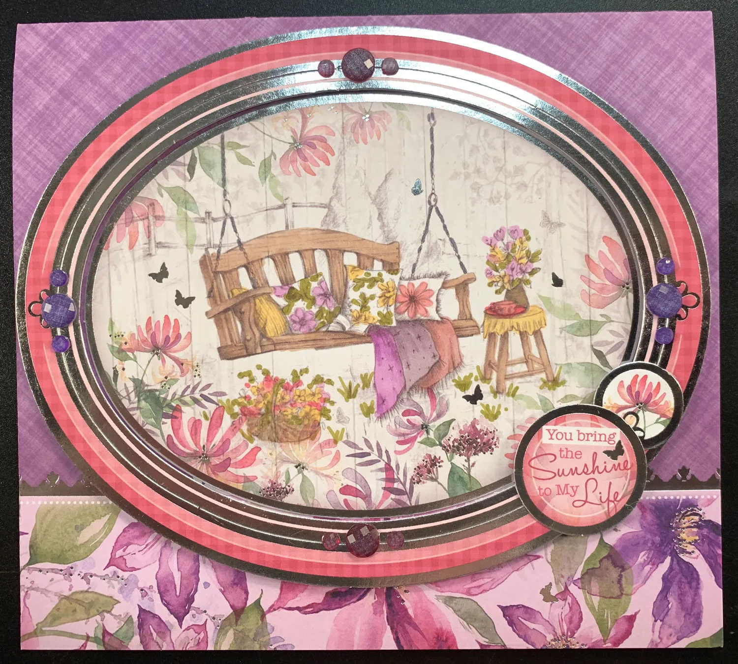 Punch out the two matching oval frames without separating them. Use foam tape to attach the frames around the swing oval. Punch out the “you bring the sunshine to my life” label and one of the small flower labels. Glue them to the frames as shown. Place four large and eight small sparkles on the frame as shown.