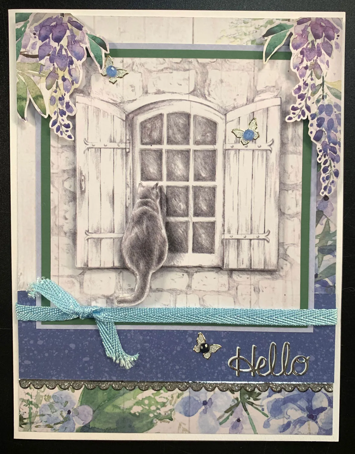 Remove three cat and window papers from the square Artist’s Garden book. Trim one to 3¾"x3 7/8" and mat it on cardstock with 1/8" borders. Mat it again on Artist’s Garden light blue paper with 1/16" borders, then glue it to the front, tucking the bottom edge under the ribbon.