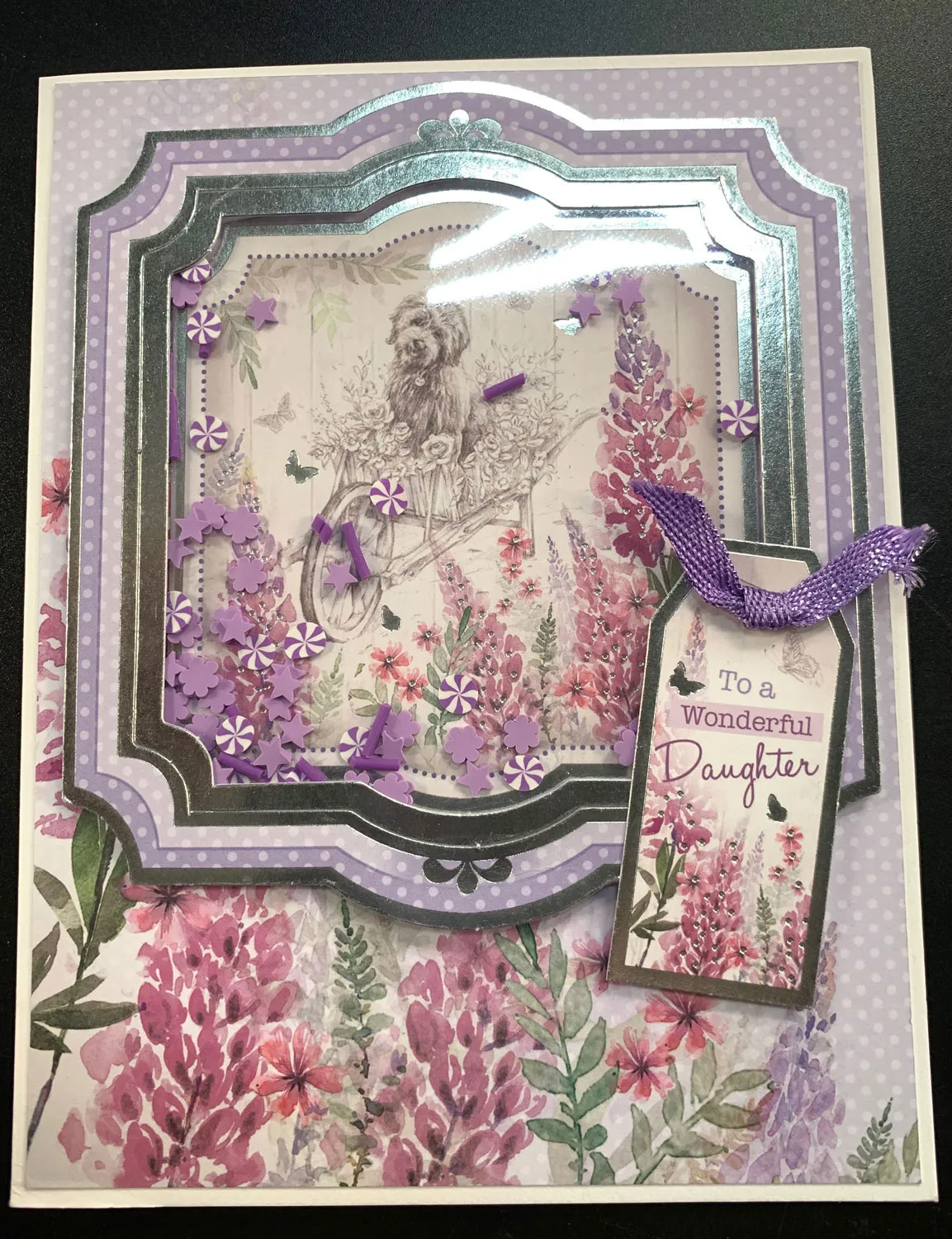 Place a heaping teaspoon of the Sprinkletz in the center of the dog image, then attach the frame on top, matching the edges of the images. Punch out the sentiment tag shown and glue it to the frame at the lower right. Knot a 3" purple ribbon and glue the knot to the tag top.