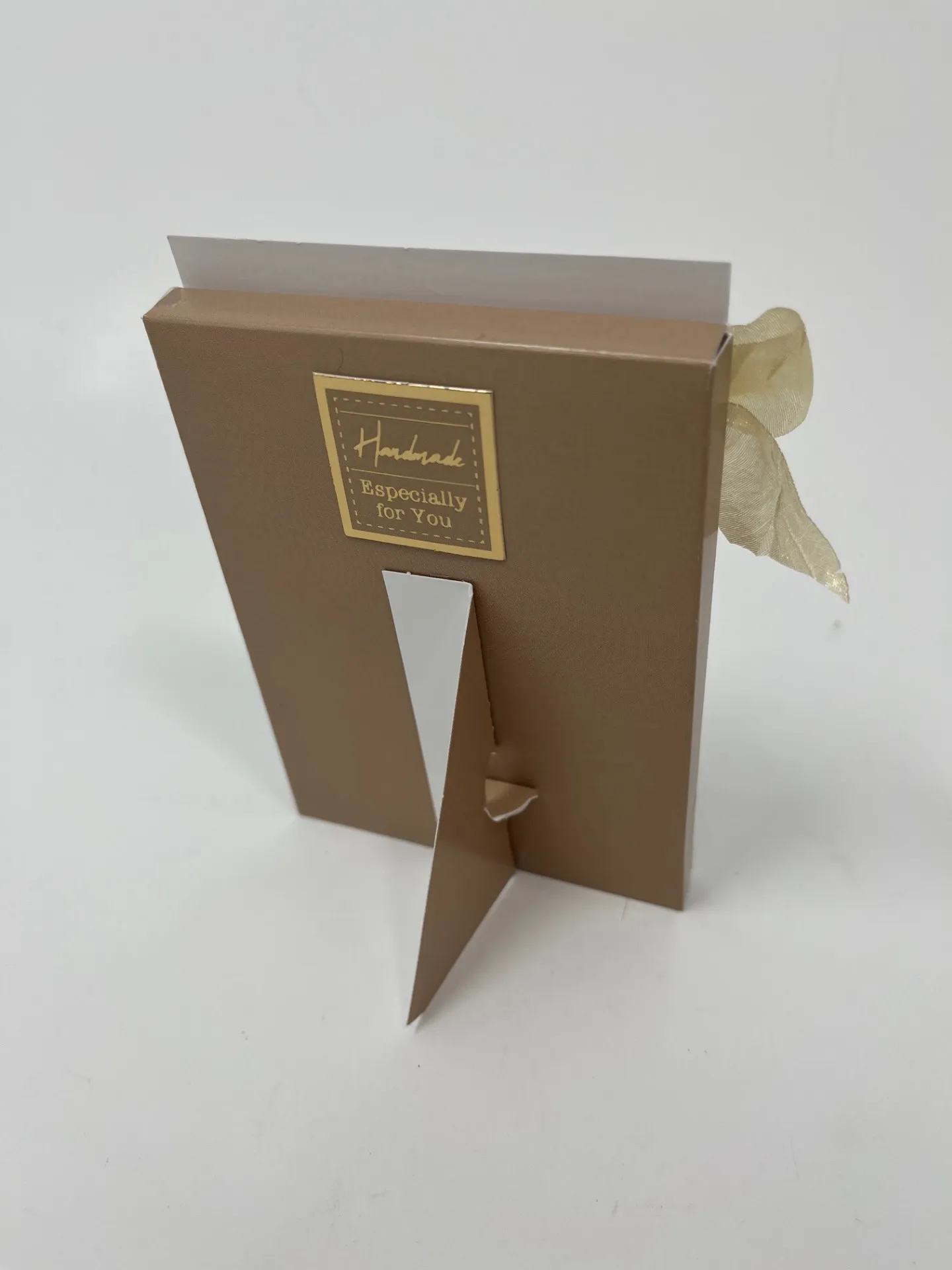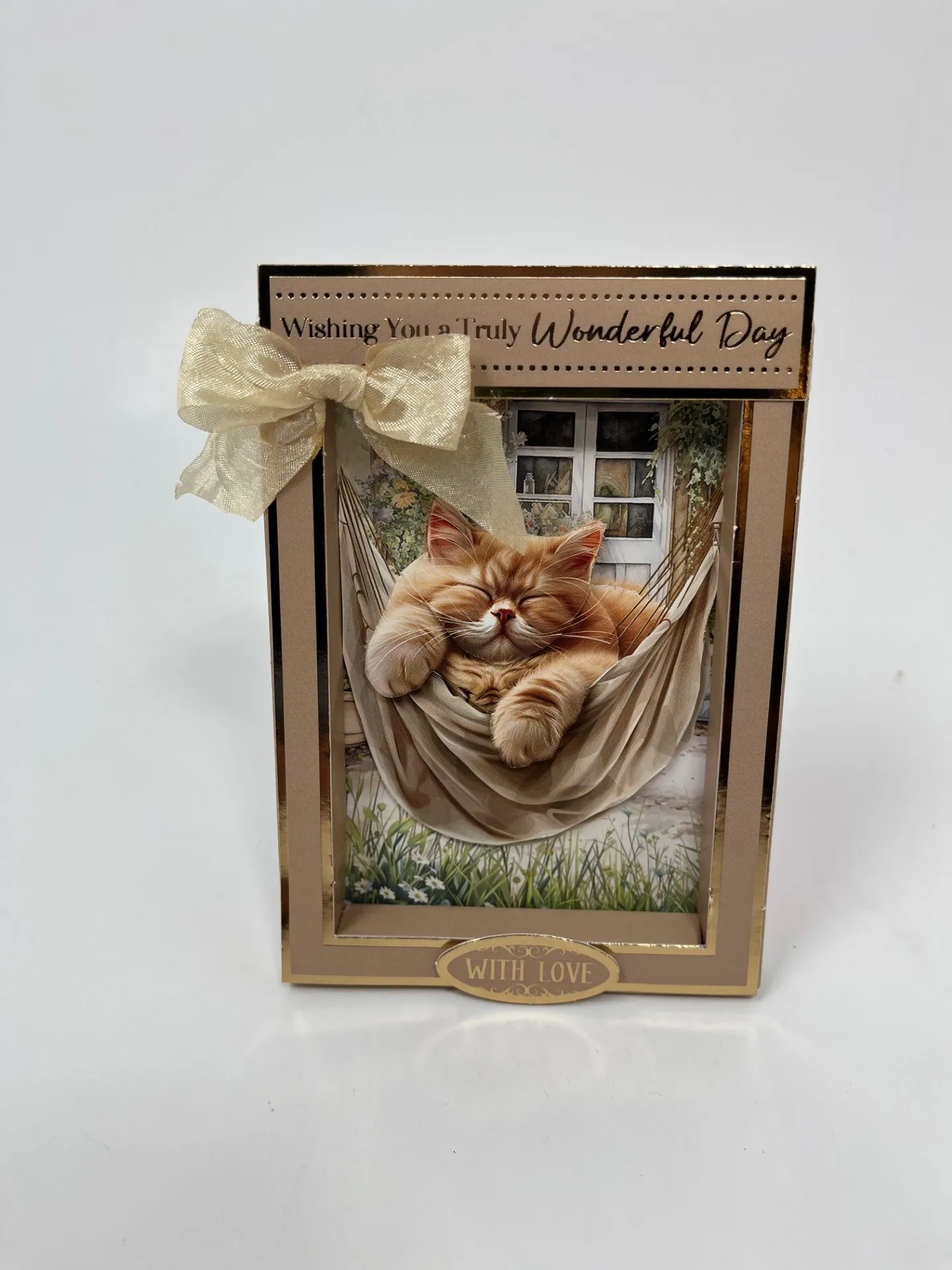 Construct the box according to instructions in the package. Place the cat page on the inside base. Cut three more pages of the cat—one with cat and hammock, one with cat only and last with the cat’s head. Foam tape over the matching art. Tape “Wishing you a truly wonderful day: at the top and foam tape “With Love” onto the frame. Make and Zot™️ a 2” wide crepe bow from the Ivory Ribbon Set and place in the top left corner of frame. Tape stand to the back.