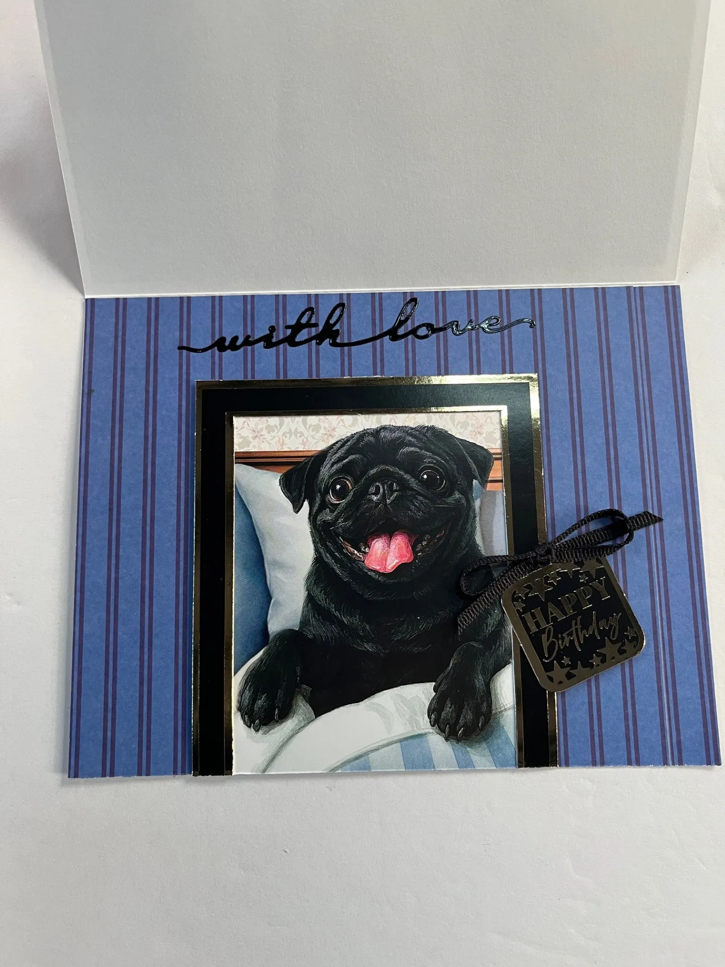 1 1/2” from each side then trim off excess at bottom. Tape and foam tape “Happy Birthday” sentiment angled to the frame on the right. Make and Zot™️ a 2” wide black bow from the 1/8” Ribbon Set and place over the sentiment. Place “with love” Dazzles™️ between the frame and the fold.