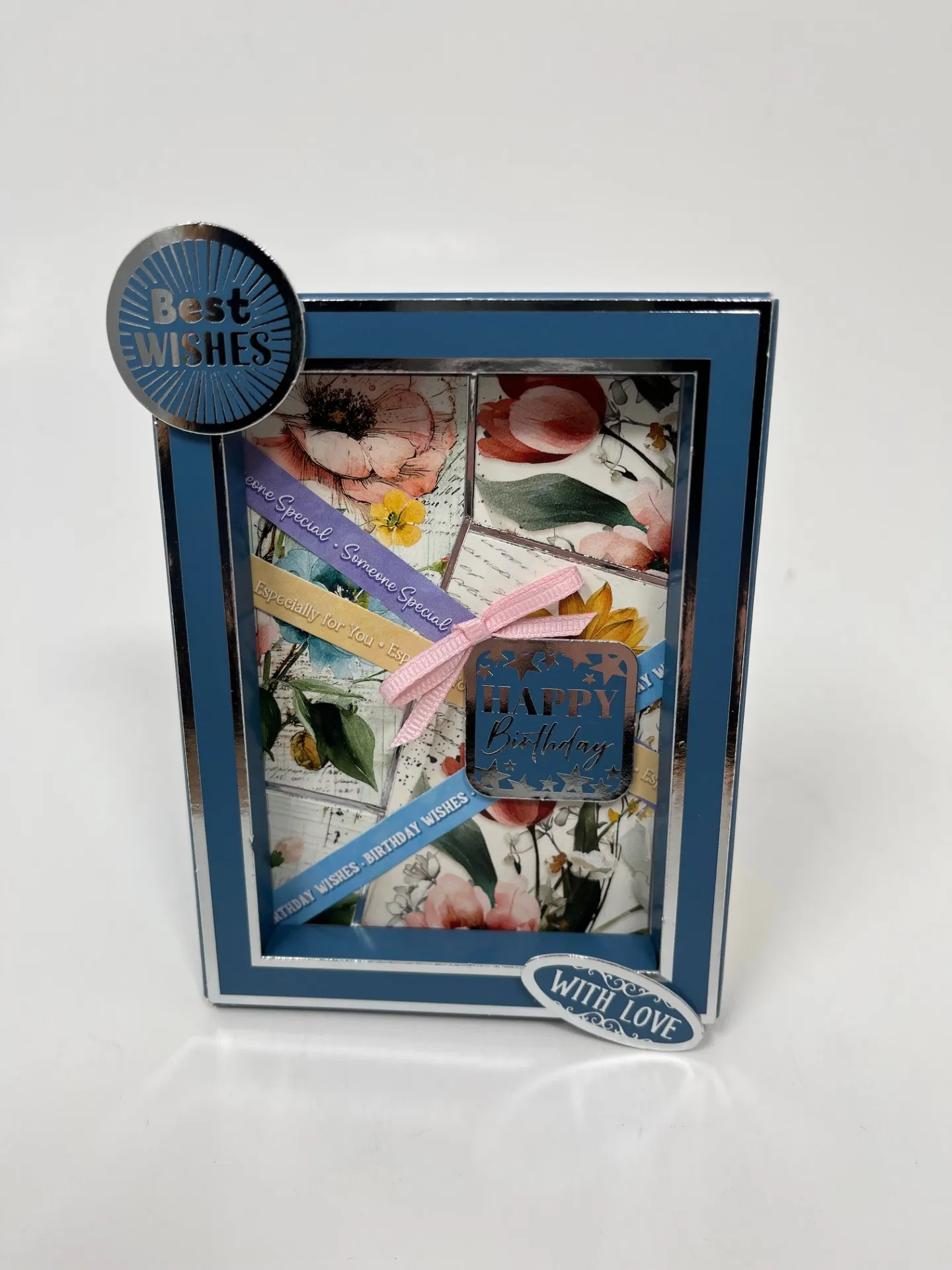 Make and Zot™️ a 1 1/2” wide pink bow from the 1/8” Ribbon Set and place by “Happy Birthday” Sentiment which covers the intersections of the ribbons. Foam Tape sentiments onto frame. Trim to 3 1/2”x4 3/4” to fit the bottom of the Box card before it is folded. Then construct the box frame following the instructions and tape the stand to the back.