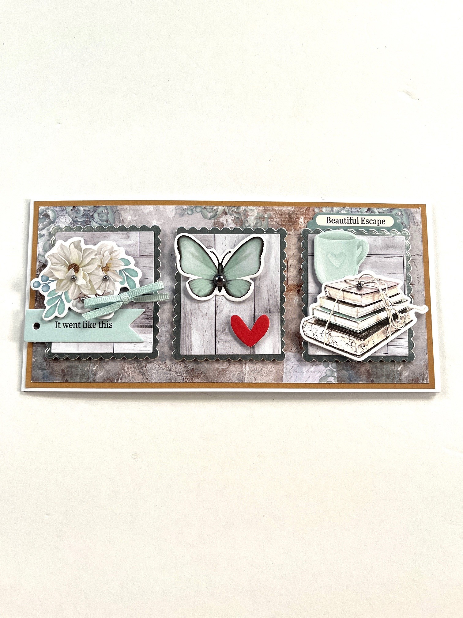 Tape two pieces of collage While Away 6x6 Cardstock together on the back. Cut 7 3/4”x3 1/2” and mat on tan Hidden Animals Solid Cardstock leaving 1/8 tan borders. Tape onto card with fold on the left leaving 1/8” white borders. Die-cut three 2 1/4” wide scalloped rectangles out of metallic silver cardstock. Die-cut three 2”x 2 1/4” pieces of the wood While Away Cardstock and tape one on each of the scalloped rectangle die-cuts. Foam tape two of the silver scalloped die-cuts 1/2” from the right and left sides and foam tape the other in in the center. Foam tape and tape While A Way Creative Die-Cuts onto each rectangle as shown. Make and Zot™️ a 2” wide aqua from the 1/8” Ribbon Set nested into the die-cuts on the first rectangle. Place Pearls as shown.