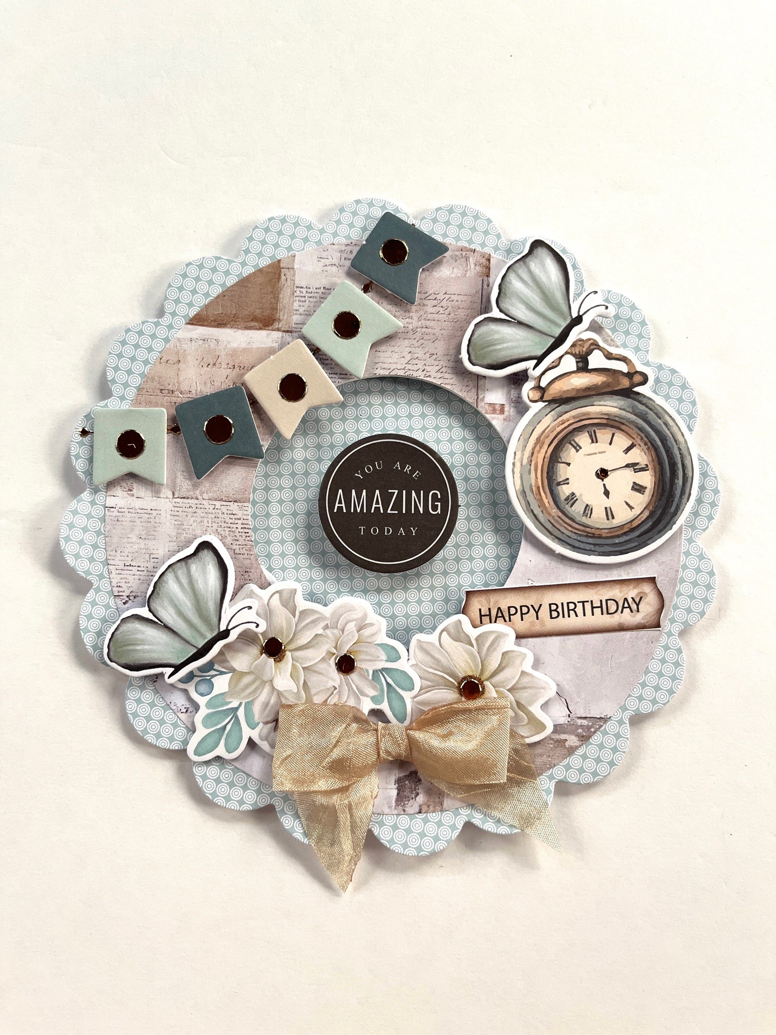 Die cut a blank card with the fold on top using the 5” circle die. Leave a 1/8” overhang to use as the hinge. Using the 5 7/8” scalloped circle die cut the light blue circles cardstock from the While A Way 6x6 cardstock and tape centrally on the card front. Use the 5” circle on the text collage cardstock. Glue to the center of the blue circles scalloped piece. Place the 2 ¼” circle in the center of the card front. Open the card and run through the die cutting machine. Tape and Foam Tape the While Away Creative Die-Cuts Around the card as shown. Place Copper and Copper Border Jewel Dazzles™️ as shown—the border is behind the pennant. Make and Zot™️ a 2” wide tan bow from the Crepe Ribbon Set and secure at the bottom as shown.
