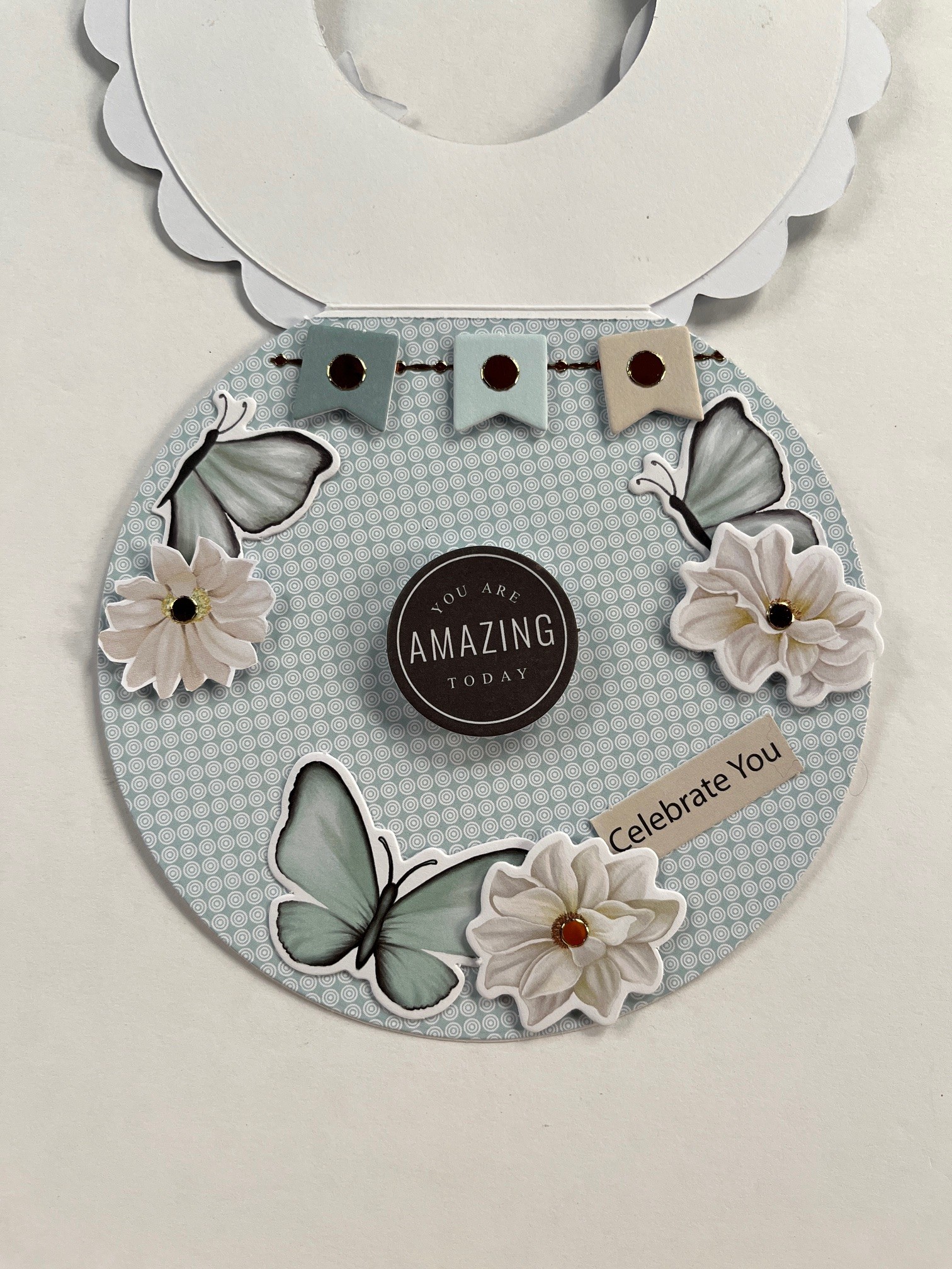 Die cut a 5” blue circles piece, trim off one section and tape to the inside card base leaving room for the hinge. Place a double layer of foam tape in the center and secure “You Are Amazing Today” on top. Tape and foam tape While Away Creative Die-Cuts as shown. Place Copper and Copper Jewel Dazzles™️ as shown.