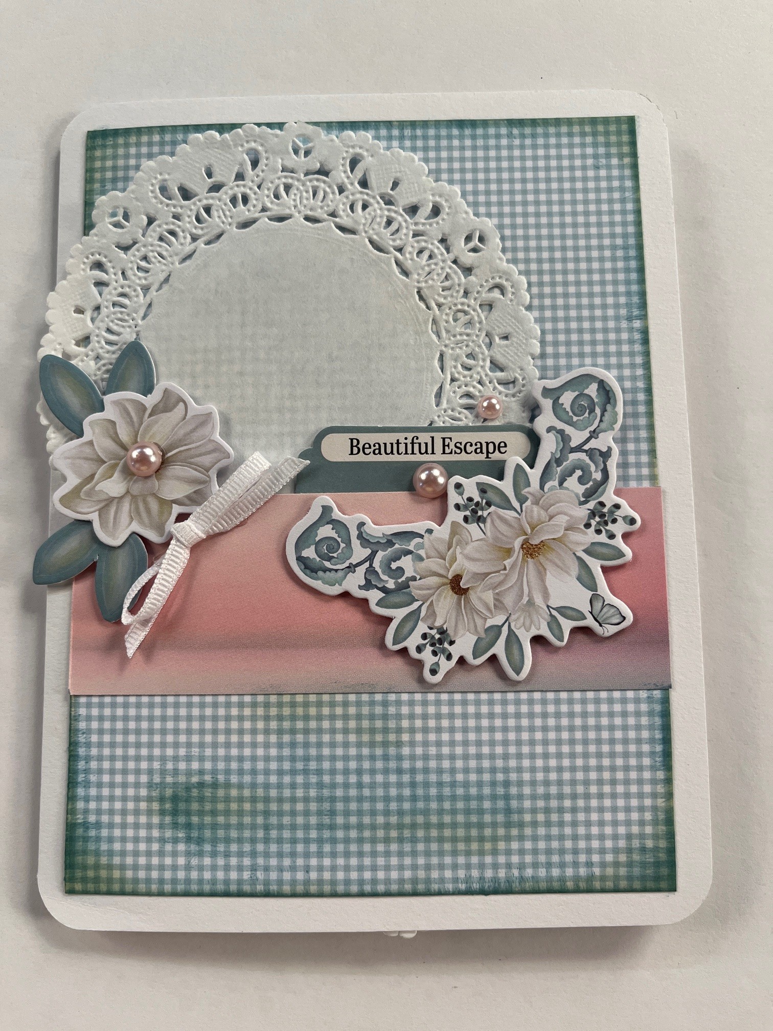 For card front: Cut 4 1/2”x6” gingham While A Way 6x6 cardstock. Place on the craft mat and use a blender brush to apply Air Force ink pad to the edges. Attach to the card front. Cut 4 ½”x 1 1/2” of pastel cardstock and secure just the bottom so it is 1 1/2” from the bottom. Tuck a doily under the paper and “Beautiful Escape” tab into the paper as well. Foam tape While Away Creative Die-Cuts as shown. Place pearls as shown. Make and Zot™️ a 2” wide white bow from the 1/8” Ribbon Set under the flower as shown.