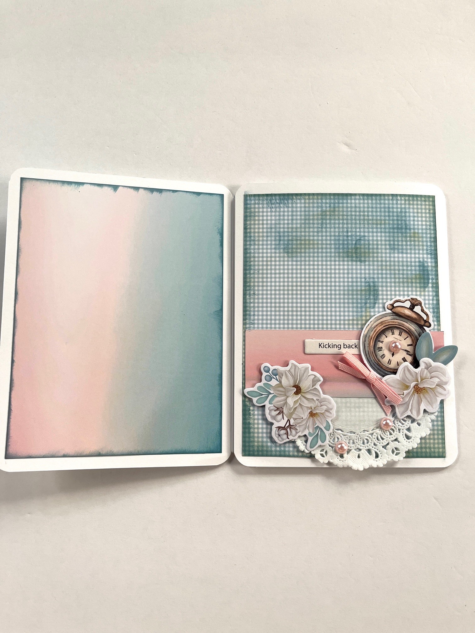 Back of right panel: Cut 4 1/2”x6” of the gingham paper and use the blender brush to apply the ink pad over the edges and lightly over the paper. Attach to the panel. Cut a 4 1/2”x1 1/2” pastel paper and tape 1 1/2” from the bottom. Tape 1/2 of a doily and tuck under the bottom of the pastel paper. Glue the clock and foam tape the flower die-cuts as shown. Add pearls. Make and Zot™️ a 2” wide pink bow from the 1/8” Ribbon Set under the clock.