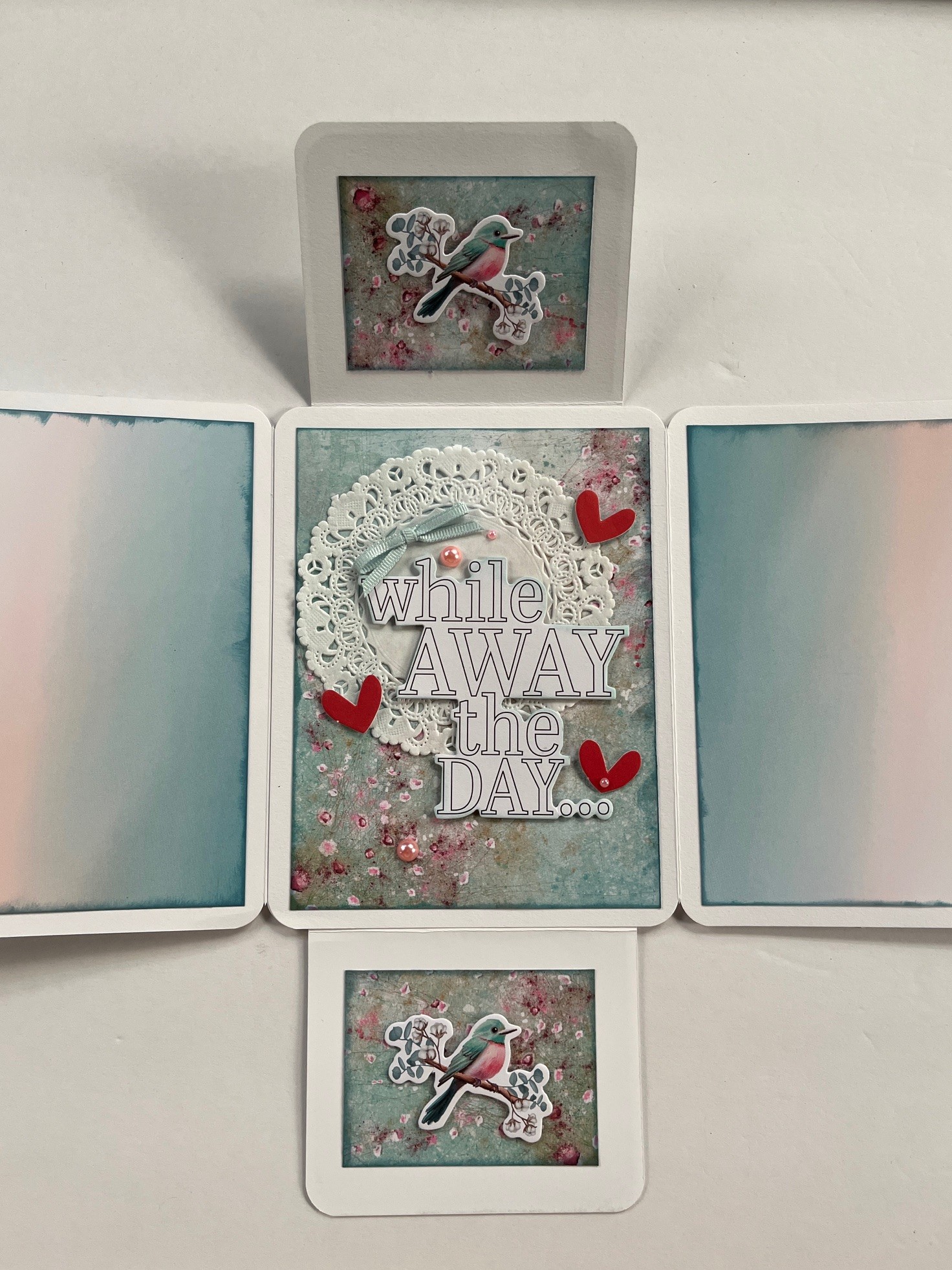 Inside: Cut two 4 ½”x6” pastel While Away papers, place on the craft mat and ink the edges as before. Attach to the left and right panels leaving 1/4” white borders Cut two 3”x2 1/4” pieces of the cherry blossom papers and round two of the top corners on each piece. Ink edges with Prism Air Force Blue ink pad. Attach one of each to the top panels. Foam tape a bird from While A Way Creative Die-Cuts to each panel.