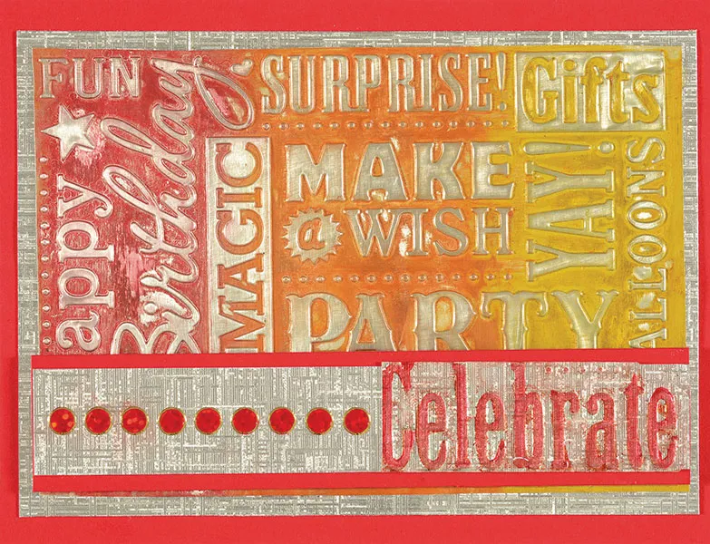 Cut a 6½”x4½” pearl metal sheet. Scribble red Gelato® on one third of it. Scribble orange on the next third, overlapping the red. Scribble yellow on the last third of the sheet, overlapping the orange. Rub it in with your finger, blending where the colors overlap. Use the embossing folder to emboss the metal sheet. Use a cotton swab dipped in acetone to remove the Gelatos® color and pearl finish from the raised words. Trim the metal to 5 7/8”x4”. Mat on Silver Linen paper with 1/8” borders. Glue to the card front.