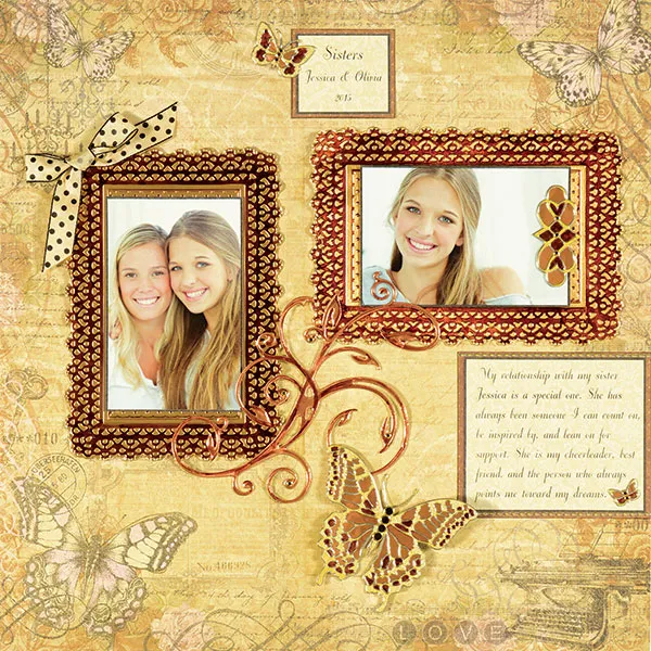Trim your photos to 3 3/4"x2 1/2" and 2 1/2"x3 3/4" and mat with On Butterfly Wings black textured paper, leaving 1/16” borders. Use Ultra Clear tape to secure a photo centered inside each frame. Tape the horizontal photo/frame on the page, 1/2" from the right side and 2 1/4" from the top. Tape the vertical photo/frame on the page, 1 1/4" from the left side and 2 3/4" from the top.
