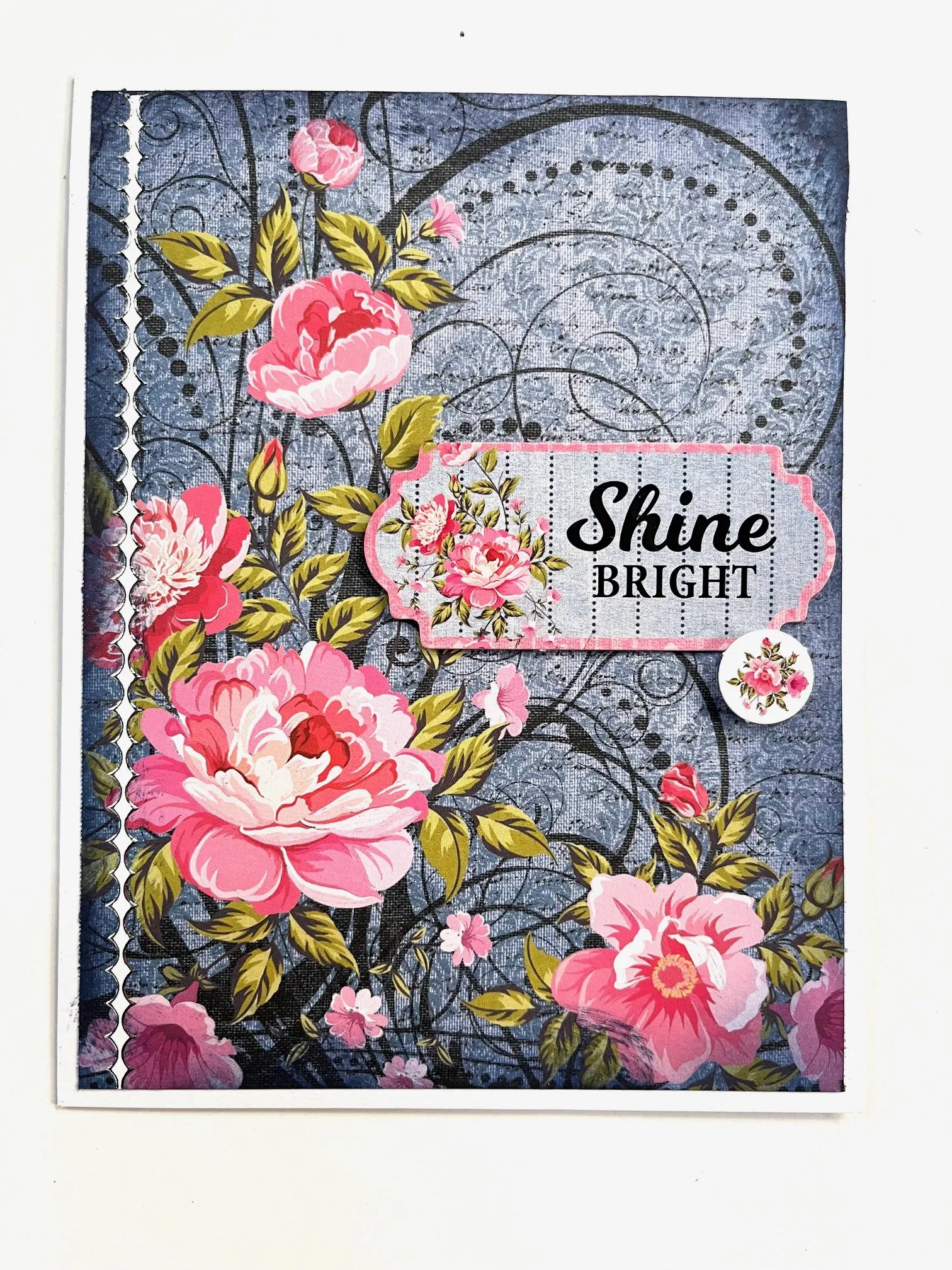 1. Cut 4 ¾”x6 ½” Denim Bouquet floral paper. Color the edges with Prussian Blue ink pad using Blender Brush. Glue to the blank card.