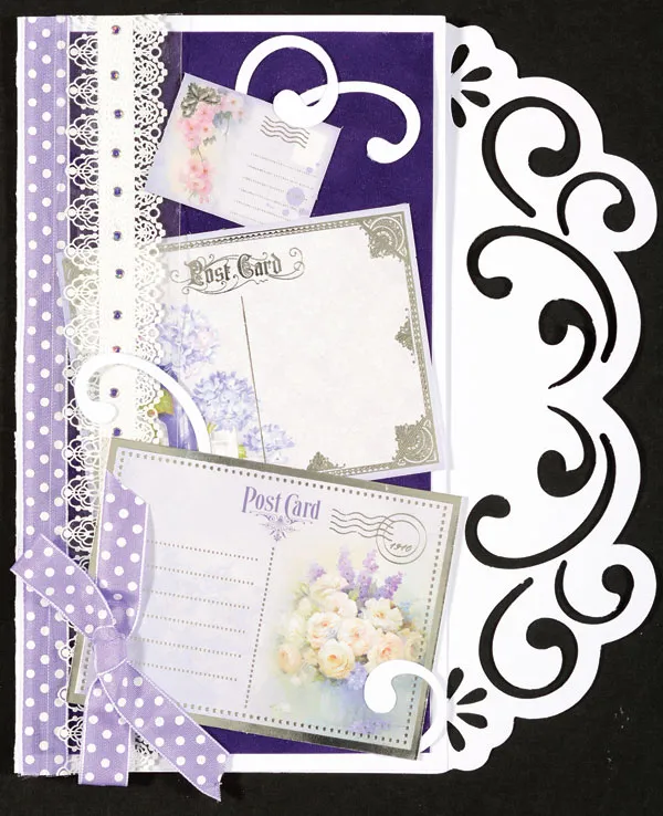 Inside Card: Glue 4”x7¾" Violet Suede paper to the card centered. Zot™ 4”x7¾" lace acetate over the lavender script. Zot™ Winter Flannels purple dot ribbon vertically on the left side of the card. Glue a medium postcard centered. Glue swirls around the postcard as shown.