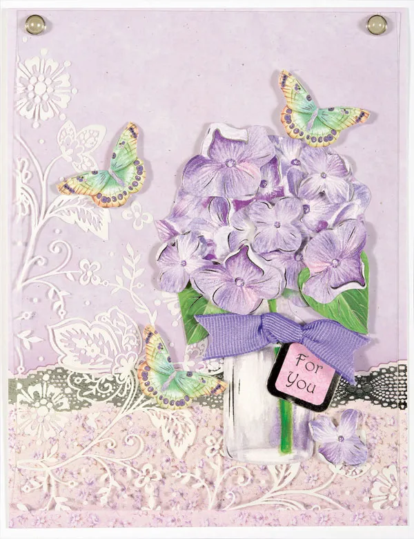 Glue the vase of lavender hydrangea die-cut, from Flawless Flowers sheet, to the right side of the acetate as shown. Foam tape 6 individual blossom die-cuts to the bouquet. Knot a length of ½” wide lavender grosgrain ribbon and cut ends to “V” shape. Zot to the base as shown with a “For You” pink square die-cut as shown.