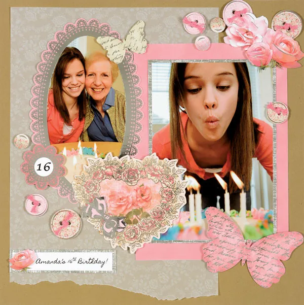Foam tape the pink and ivory butterflies, from Layers & Lace page, to the edge of the photos as shown. Glue and foam tape a cluster of 3 pink and peach rose die-cuts, from Rose Lace Bouquet page, at the top right corner.