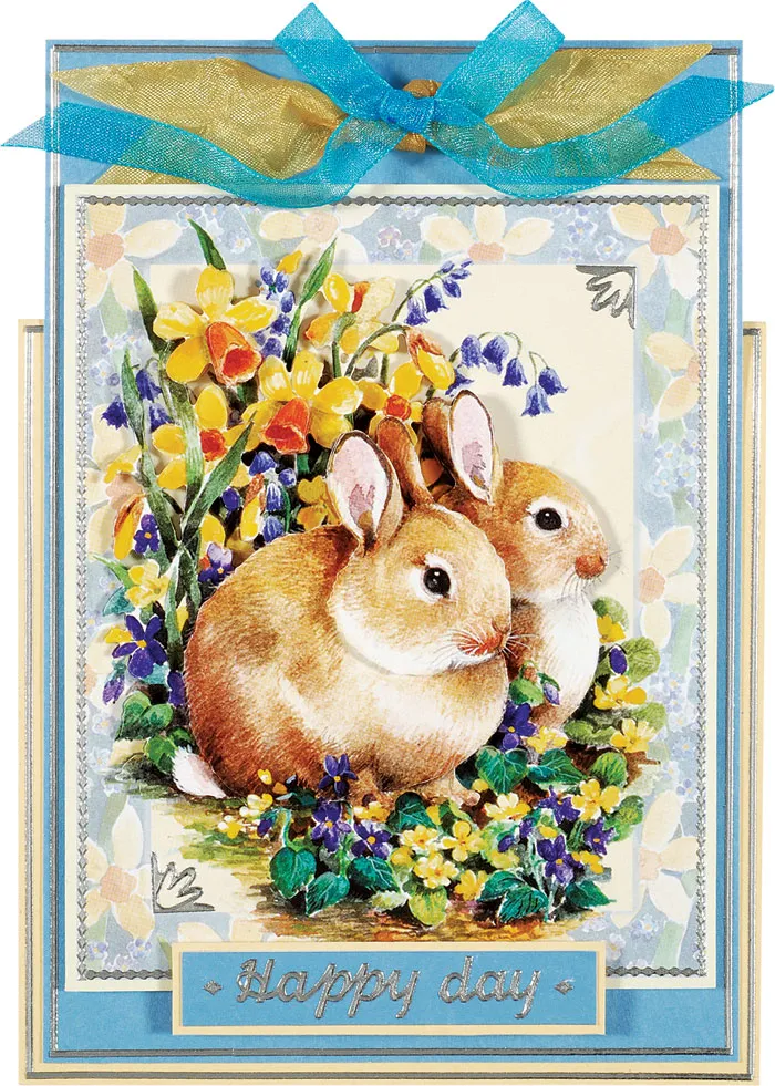 Cut out the bunny backing paper, 1/16” outside of the artwork. Follow the kit instructions to pop out and foam tape the corresponding numbered die-cuts to the artwork. Place thin dot line stickers around the artwork edge and two corner bracket stickers on opposite corners. Foam tape 1/2” from the lower edge of your card.