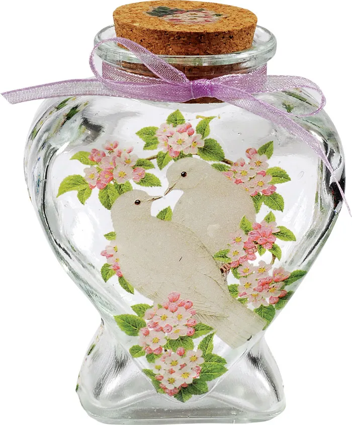Cut the doves transfer image out, close to the image, but not precisely. Follow the book instructions for applying to surface using a small sponge and water. Remove backing and smooth image around bottle edges using sponge. Let dry.