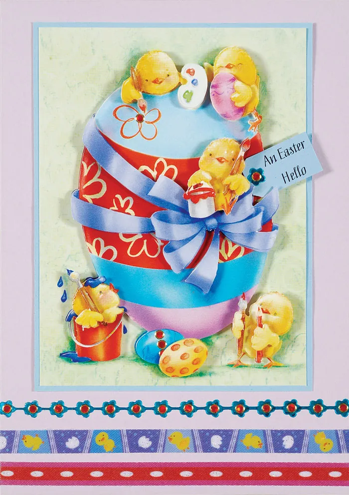 Add border stickers evenly spaced below the card topper as shown. Write or computer print “An Easter Hello” on light blue cardstock. Trim to a small tag and foam tape overlapping the right edge of the egg embellishment. Trim a tiny flower from remaining flower sticker and place on the end of the tag. Add red Jewel Dazzles™ stickers to decorate the flower sticker border, individual flower sticker, and die-cut embellishment as shown.