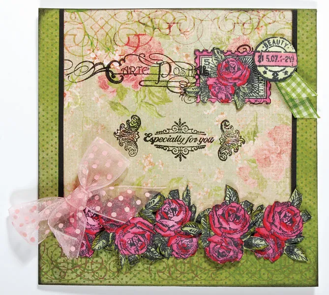 Place the card with the fold on the top. Cut into a 5” square. Cover the card with green dot paper with the border along the bottom edge. Place a 4” square of tan/green rose paper with a border along the top. Mat the 2 sides and bottom with black cardstock, leaving a 1/8” border. Stamp a rose postage stamp near the top right corner. Glue the colored rose postage stamp over the image. Stamp “Carte Postal” to the left, slightly overlapping the rose stamp. Stamp a swirl to overlap the words on the left. Glue a folded length of lime green gingham ribbon under the cancelled postage circle and foam tape to the far right. Stamp “Especially for you” below with a corner stamp on each side. Glue stamped square to the top of the green card.
